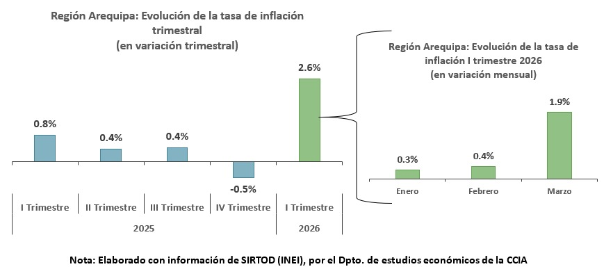 En Arequipa, durante el primer trimestre se presentó un incremento significativo de la inflación alcanzando una tasa de 2.6%, este resultado está asociado a los acontecimientos ocurridos en los primeros meses del año, que afectaron tanto el abastecimiento, explicado en el aumento de los costos logísticos en la región, contribuyendo a una mayor presión inflacionaria en determinados rubros.